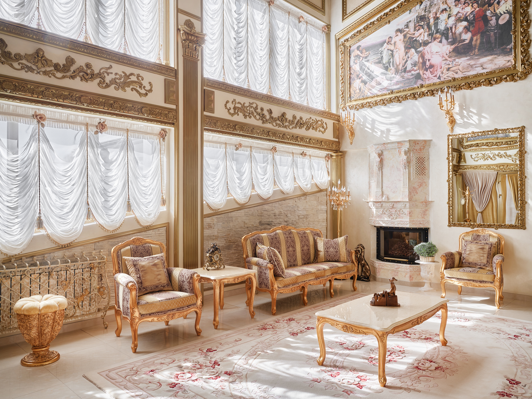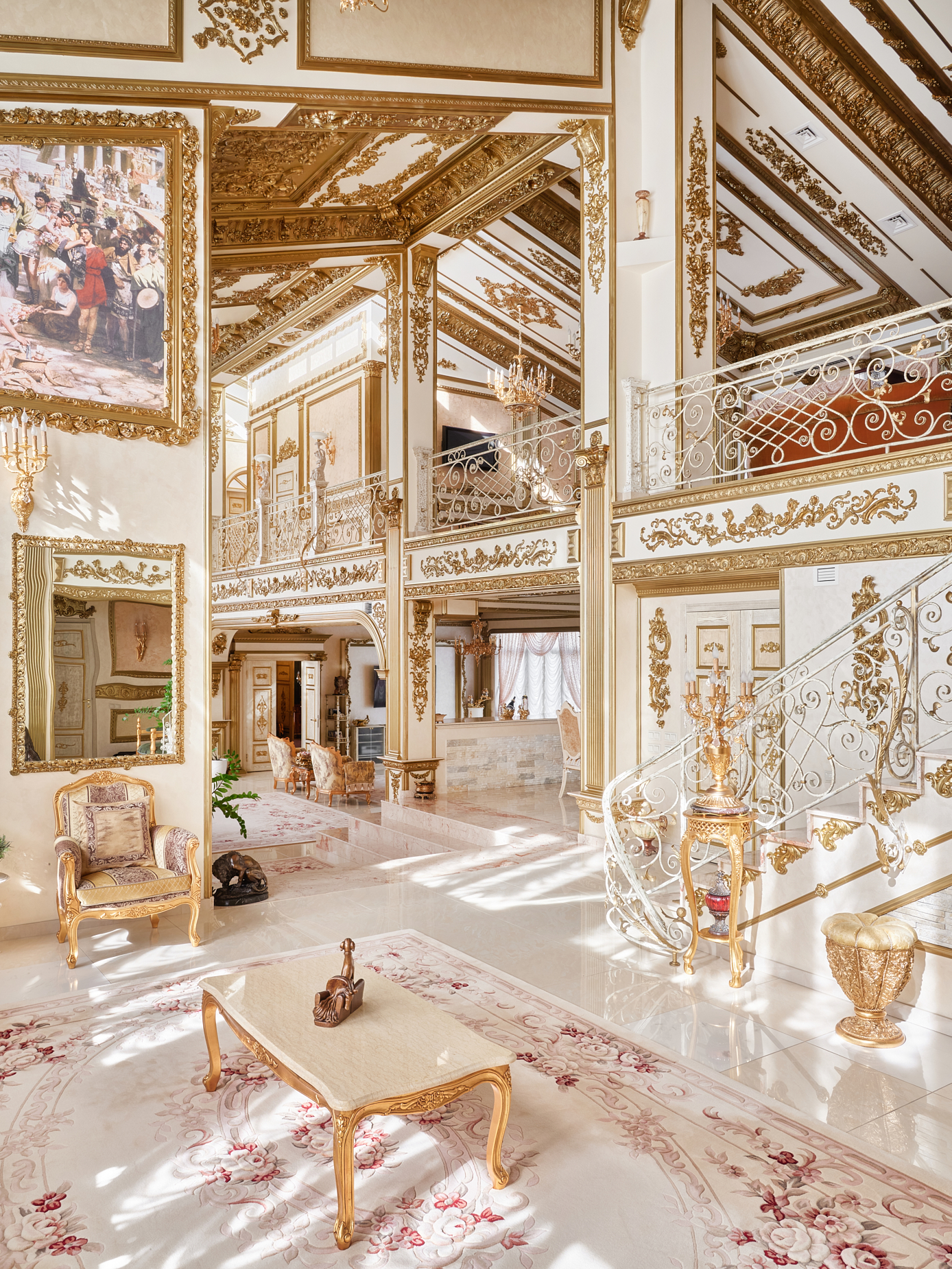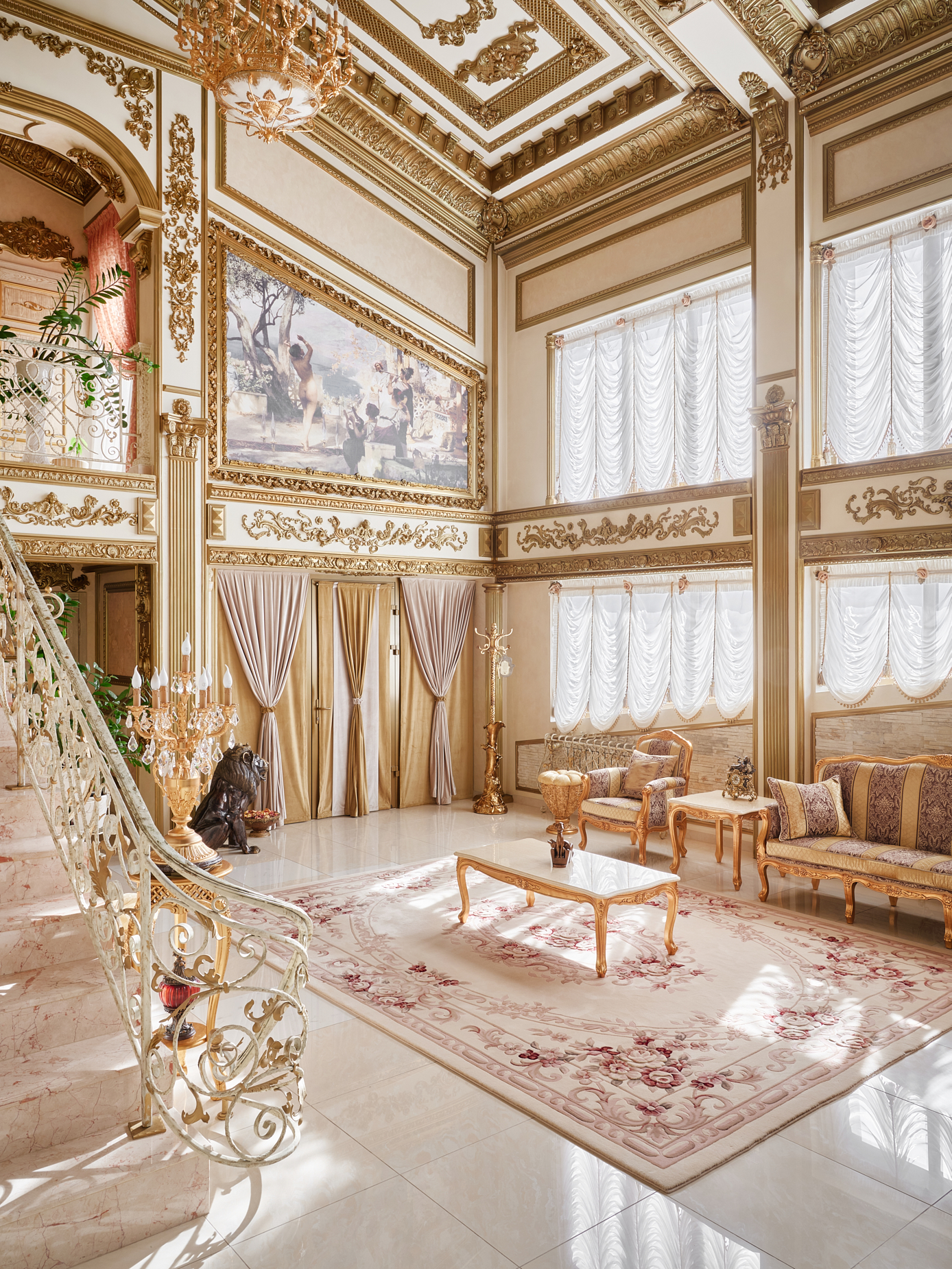 · Гостиная: с двусторонним камином, вторым светом и высотой потолков 11,5 метров.