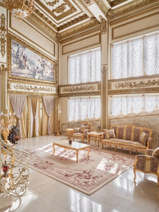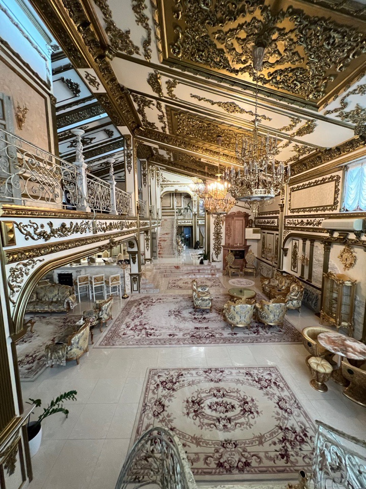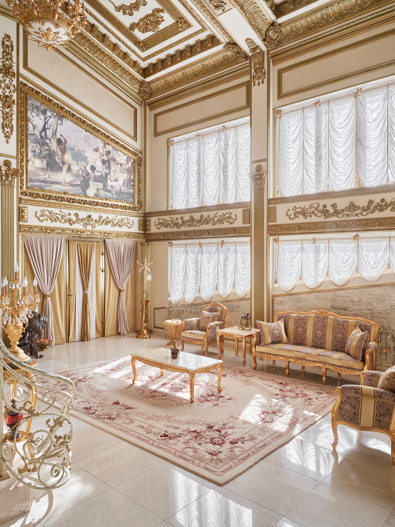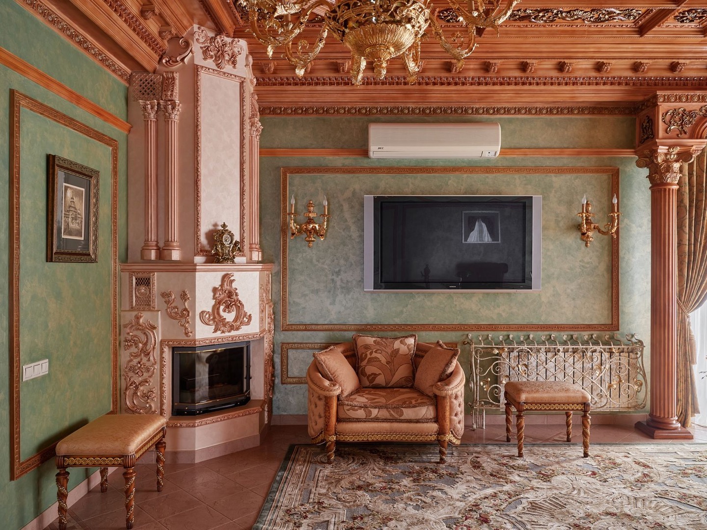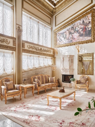 · Гостиная: с двусторонним камином, вторым светом и высотой потолков 11,5 метров.