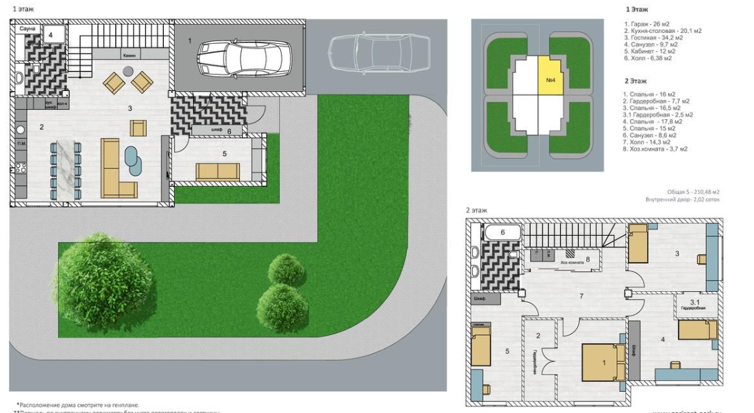 На первом этаже – гараж на 1 авто, гостевой санузел, просторная гостиная – кухня, откуда осуществляется выход на придомовую территорию под благоустройство зоны отдыха