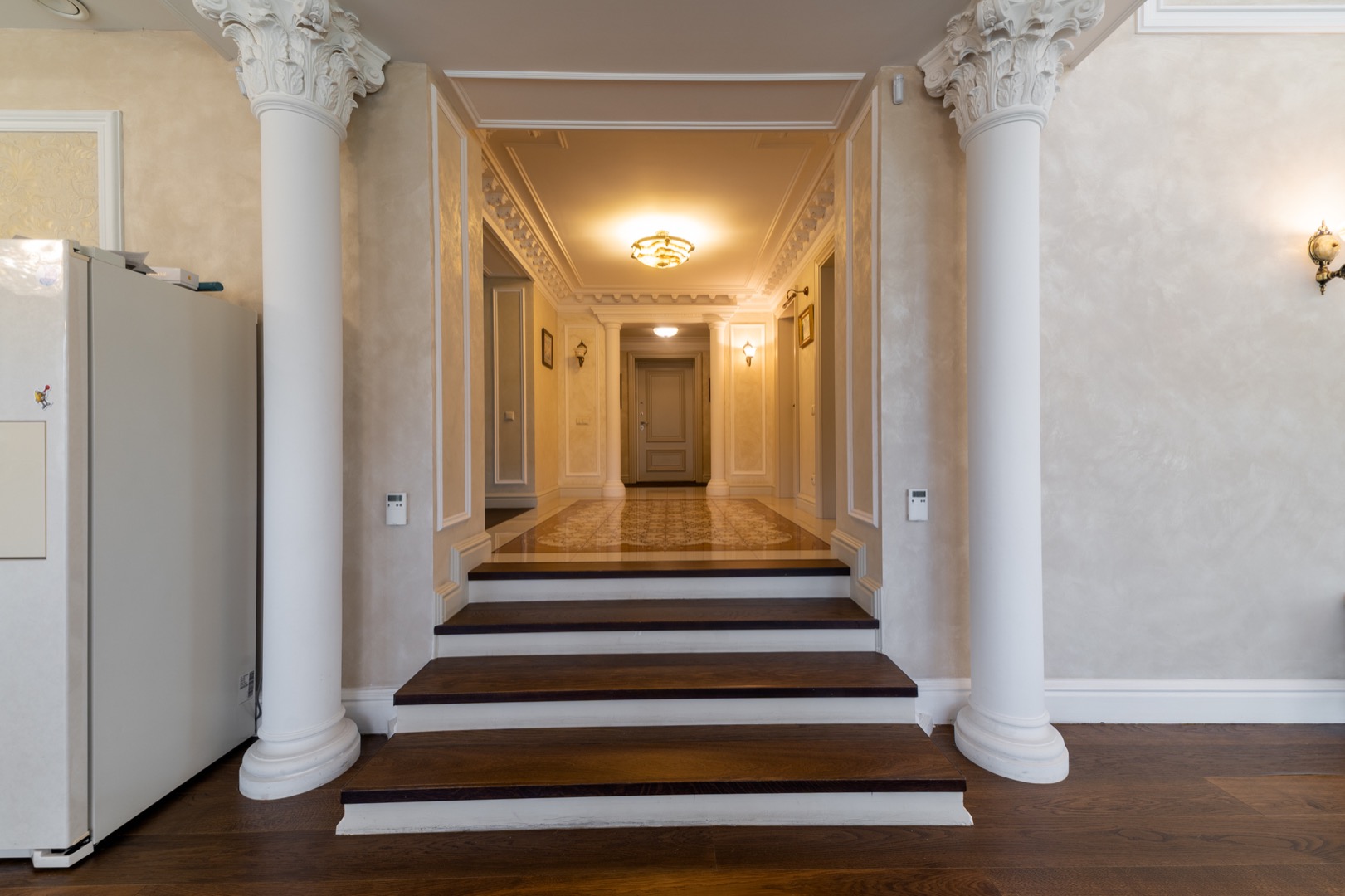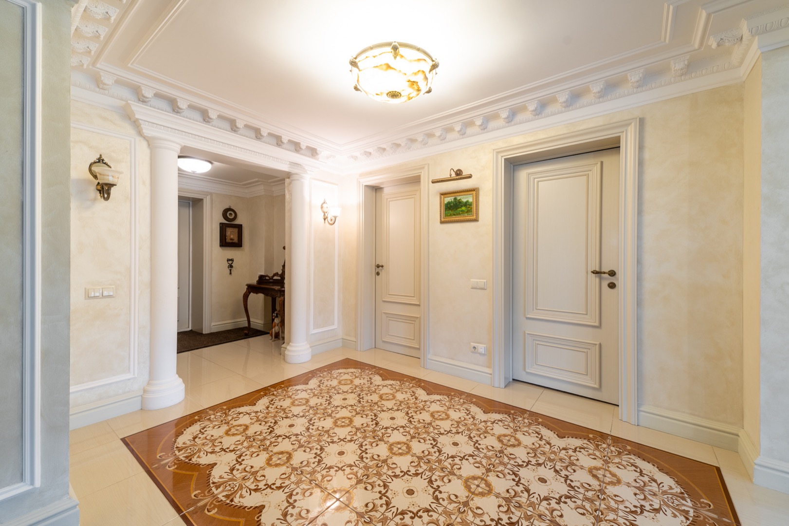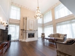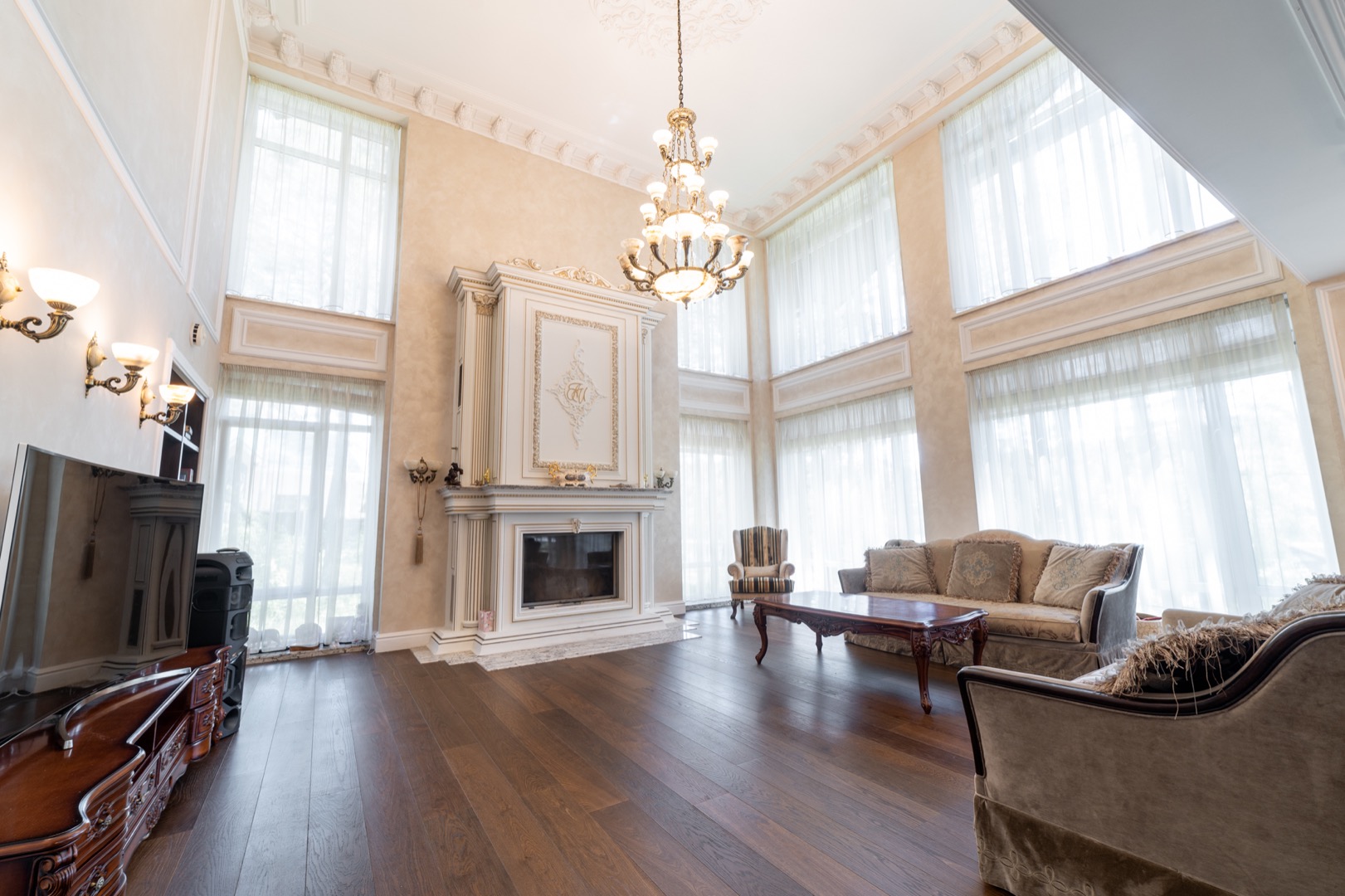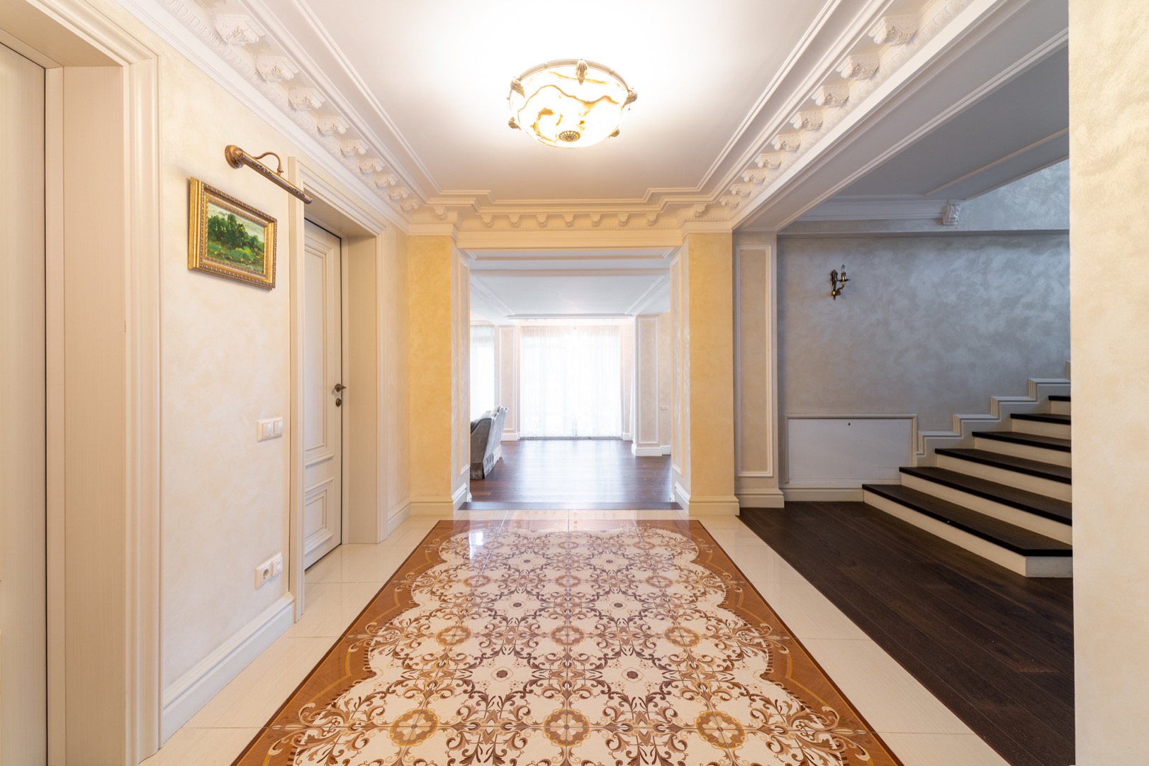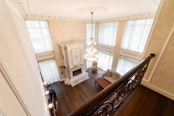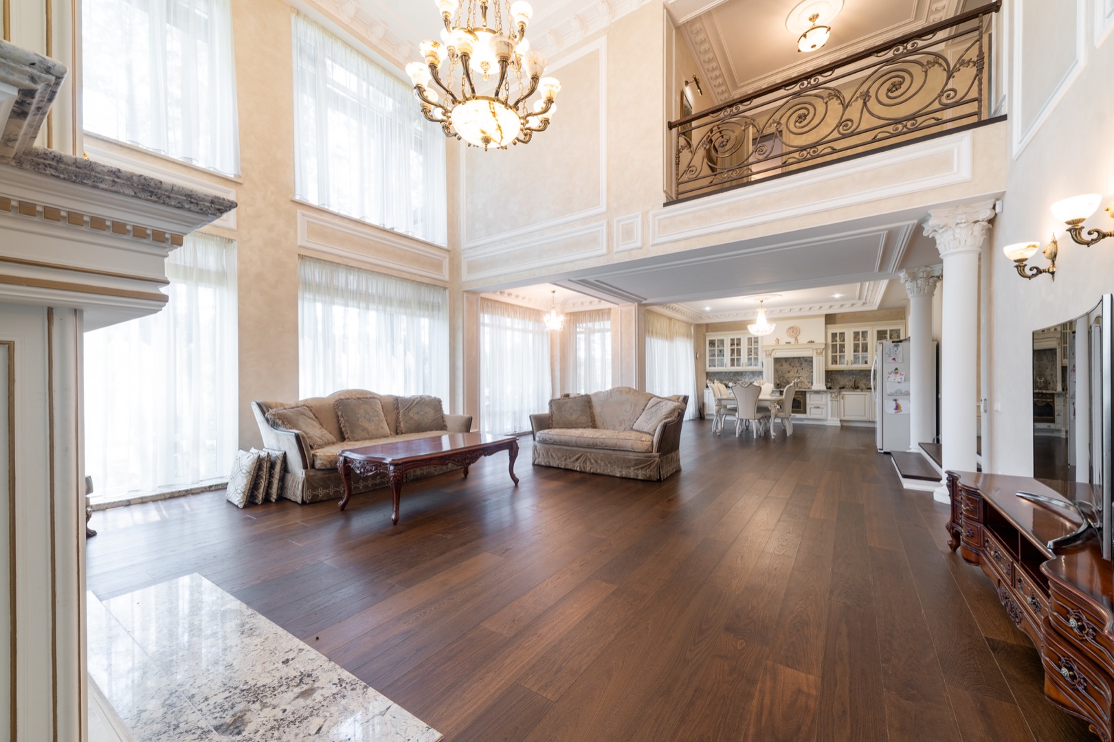 1 этаж: Стильная и продуманная Кухня-столовая с выходом на террасу, гостиная с камином и большая стилизованная под интерьер люстра из оникса, 5 метров высота, "второй свет"