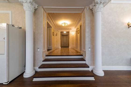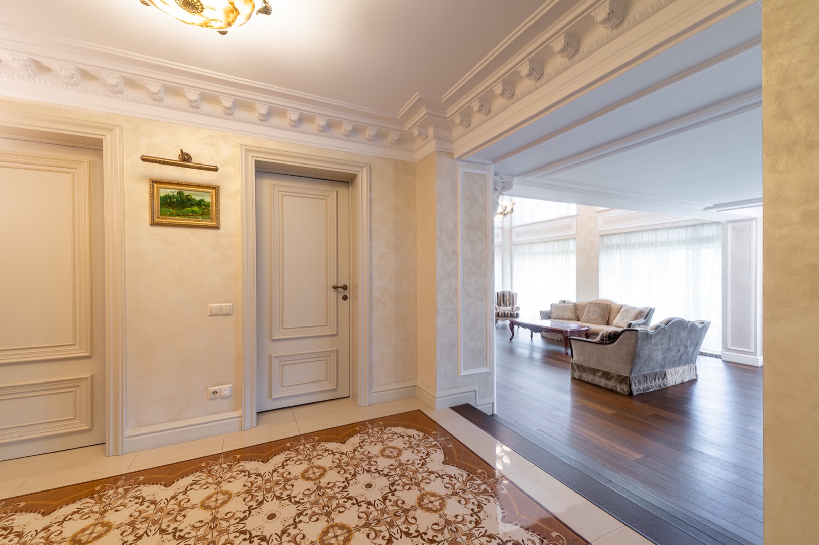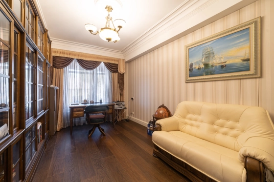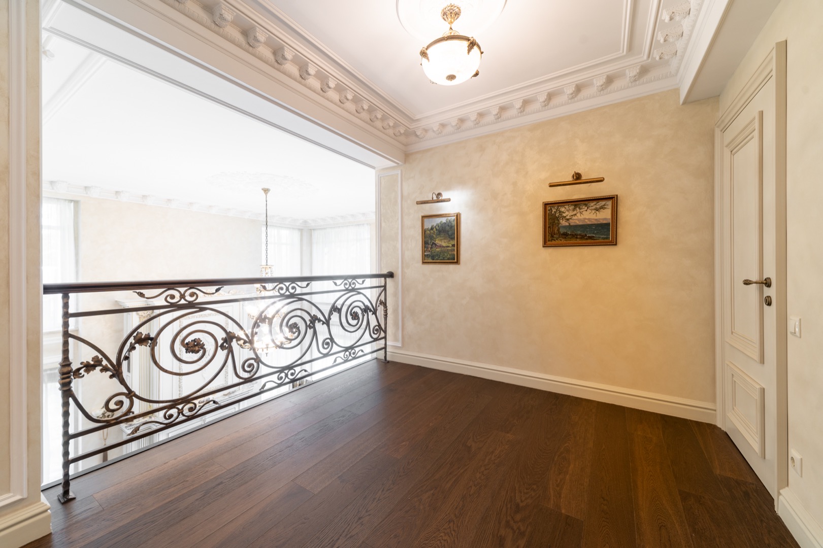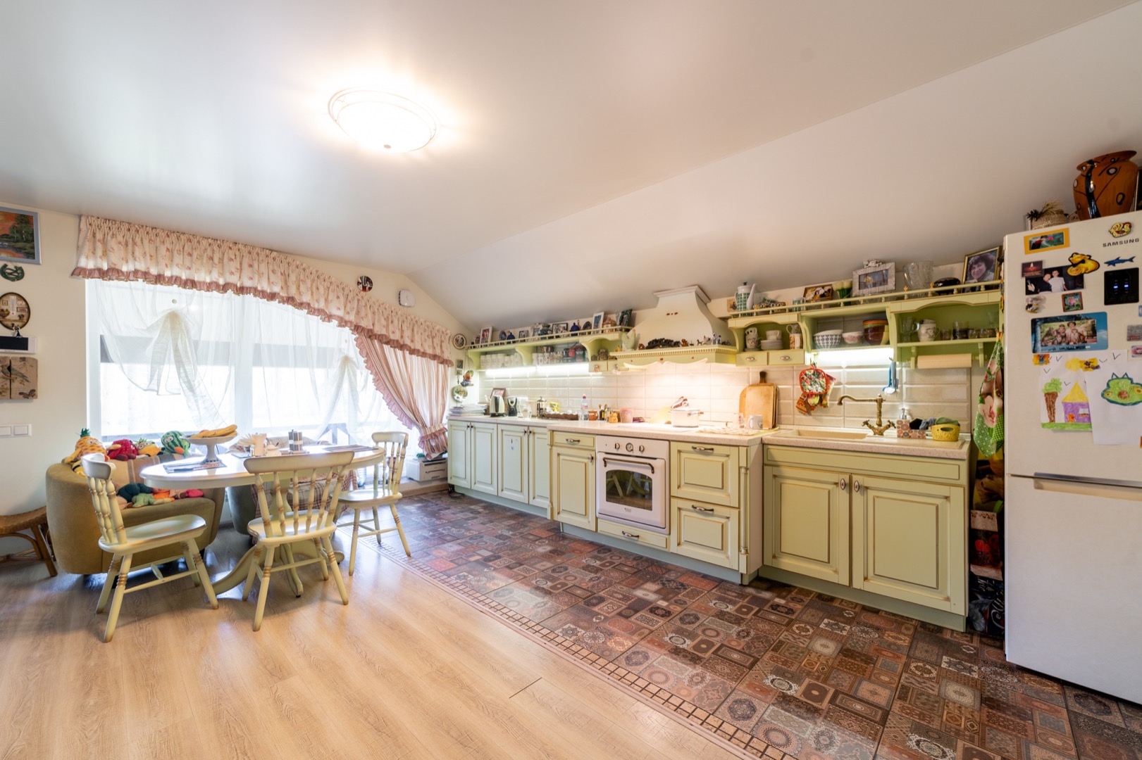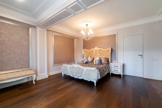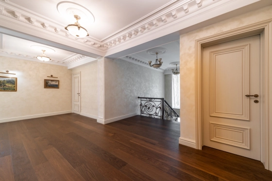 На полу паркетная доска и весь дом с теплыми водяными полами- комфортно и красиво ( ни одной батареи на стене)