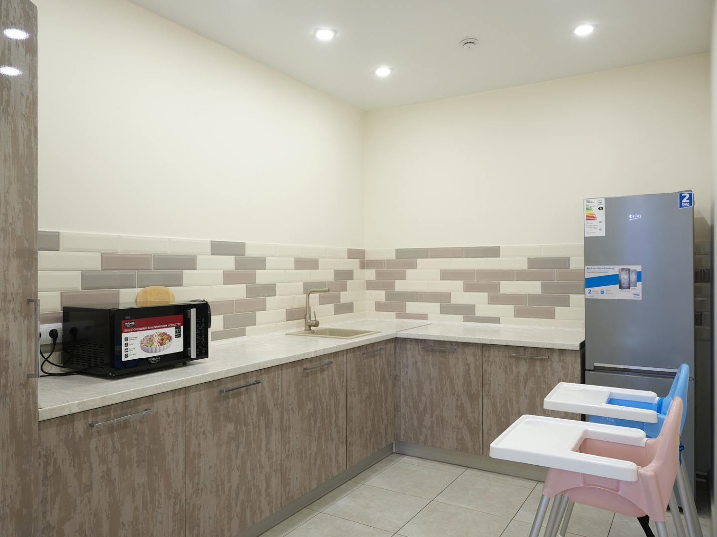 • Оборудовано всем необходимым – дизайнерские декорации, мебель, бытовая техника, профессиональная аудиотехника, детские игрушки, зона ресепшн. Вся мебель изготовлена по индивидуальному заказу.